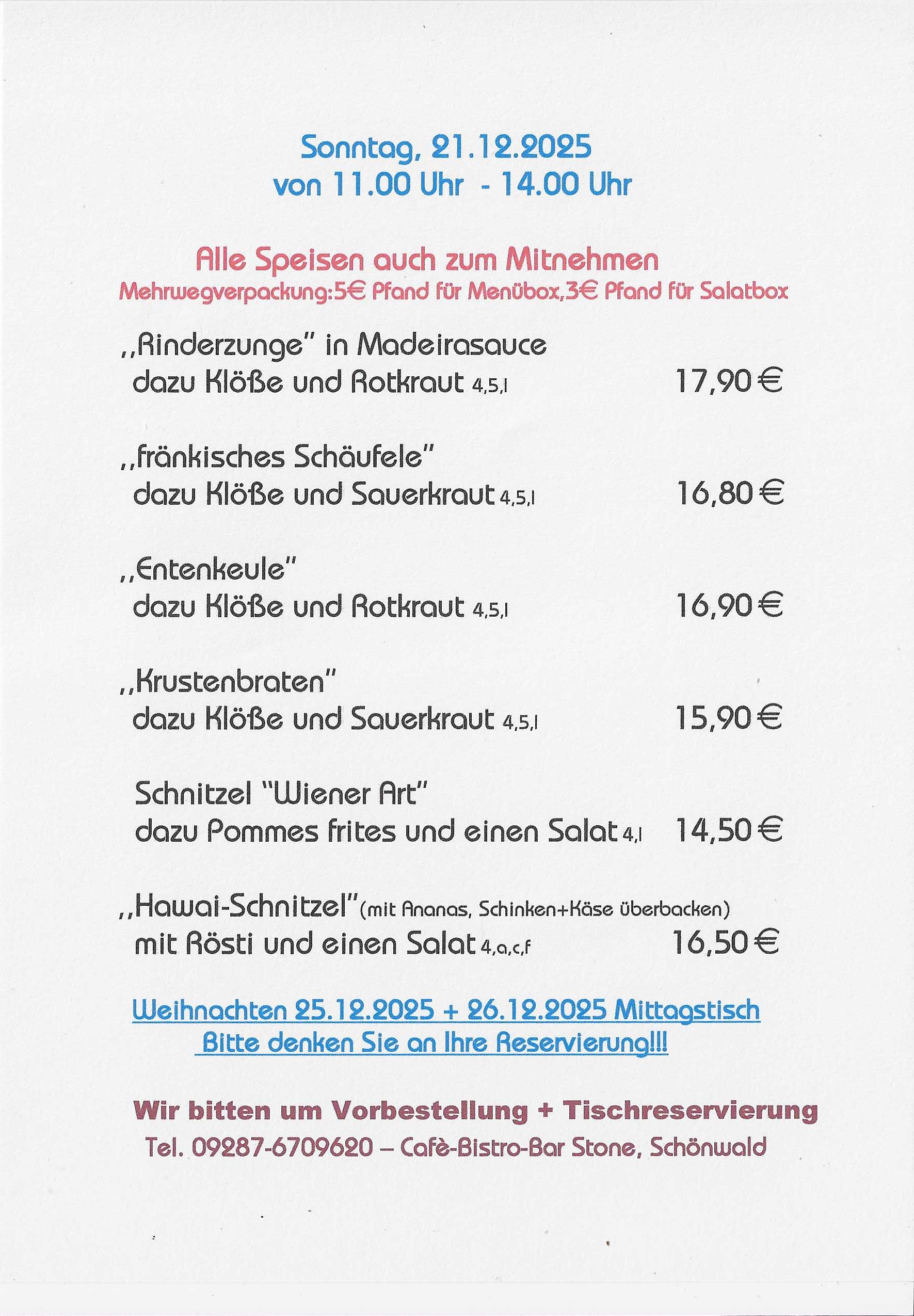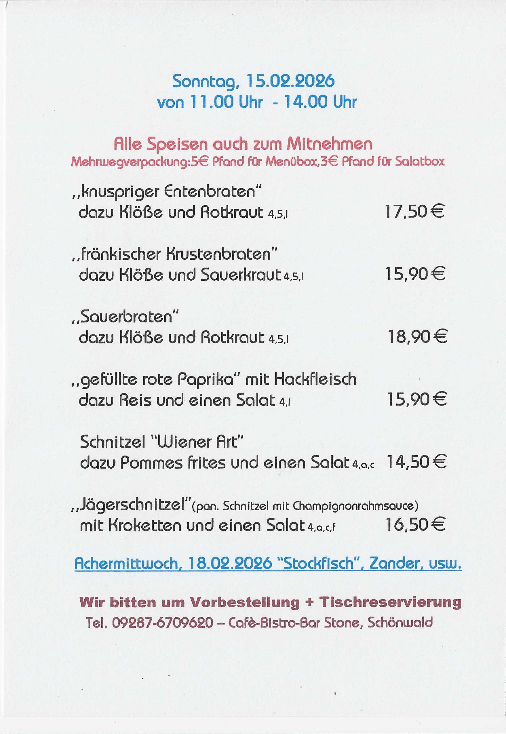 Jeden Sonntag bietet unsere Küche zum Mittagstisch verschiedene Bratengerichte nach fränkischer Art an.